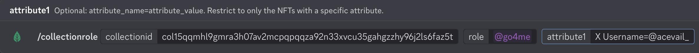 Use the command /collectionrole to link a role to a specific NFT collection.